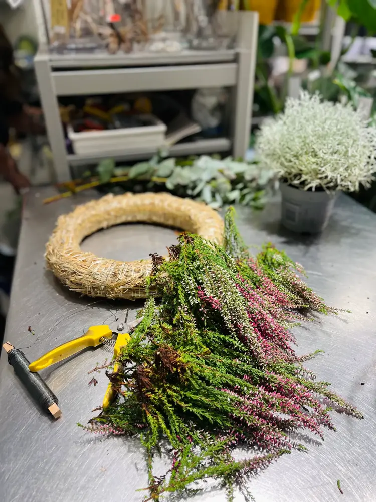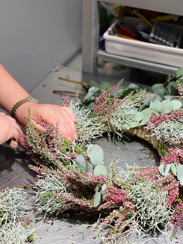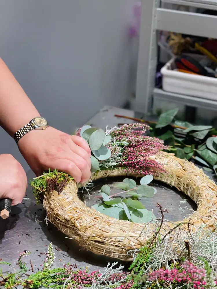 Samle sammen litt og litt med blomster/planter og begynn å legge på kransen.